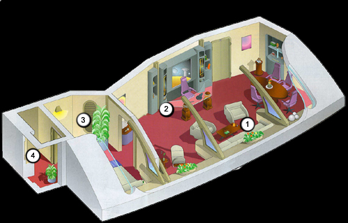 | Description | Senior officers' quarters are, as expected, often more lavishly decorated and furnished than other contemporary Crew Quarters. This often includes the addition of artwork, plants, larger and more comfortable furniture, and the like. Whether or not they are bigger in terms of size and volume depends on the class of ship (explorers typically have larger quarters; escorts, much smaller), the shipyard's interior design plans, and the amount of unused volume when everything else has been installed. For the most part officer quarters are slightly bigger, whether by design or necessity. Included are an enlarged living room/work area, a bedroom, a fully equipped head, a dining table, and a large desk. These quarters also have large-screen LCARS displays and the "usual" amenities such as a replicator, personal holographic viewers, null-grav sleeping chambers, and provisions for pets. Officers with families are normally assigned a suite and in certain situations single quarters can be combined into larger ones where available by reconfiguring walls and bulkheads. Certain quarters can also be adapted to Class H, K, L, N, and N(2) environments for species requiring those settings. Senior officers (Lieutenants and above) normally are alloted their own quarters no matter the class of vessel, but they may only be as big as any other berthing area aboard. Junior officers (Ensigns and Lieutenant JGs usually, unless they are department heads) on certain classes are expected to share quarters, typically with another officer of the same rank. They have separate bedrooms but share the same living area and head. In some classes of ship, an officer's cabin also doubles as an office. Officers who have spent more than six months in a berthing are allowed to request redecorating or remodeling of their quarters. |